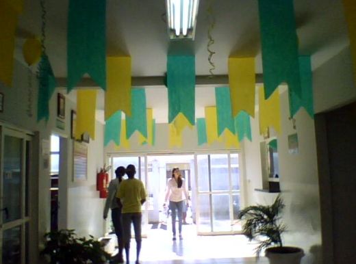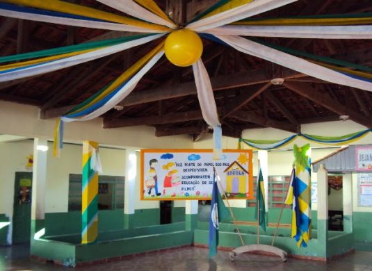 Se o orçamento de sua escola é pequeno para a decoração, basta investir na criatividade para alcançar um belo resultado. Utilizar faixas de tecido ou de papel mais maleável e enfeitar o teto é ótima opção, pois além de barato, este tipo de décor ainda modifica rapidamente o visual de todo o ambiente. E se a escola possuir bastante material vale também enrolar as faixas de tecido ou papel nas pilastras e colunas do pátio, diretoria e onde mais a escola possuir e o material for suficiente.