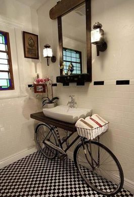 Tem algum elemento diferenciado encostado em algum cantinho e quer usá-lo na decoração? Então invista nesta peça para apoiar a cuba da pia, caso a peça seja alta o suficiente. E neste caso você poderá utilizar até mesmo bicicletas antigas para decorar seu lavabo e deixá-lo com visual muito mais interessante.