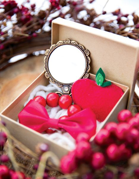 E até mesmo para oferecer como lembrancinha em sua festa de aniversário você pode investir na maçã, que pode vir em formato de uma linda e diferenciada pulseirinha para as meninas e também em maça de feltro para guardar a pulseira quando a garota chegar em casa. E vale também incrementar a lembrancinha oferecendo espelho (outro item que aparece muito na história) e um charmoso lacinho.