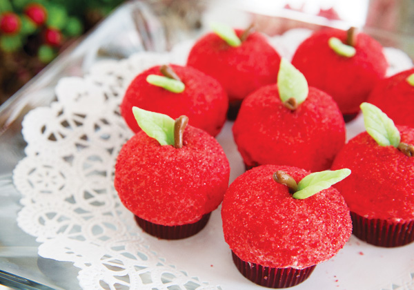 Os alimentos servidos em sua festa também podem ter o formato da maçã, como os docinhos, ou com as próprias maças servindo de alimento base para a preparação dos outros itens ou sendo servidas em sua versão original e natural.
