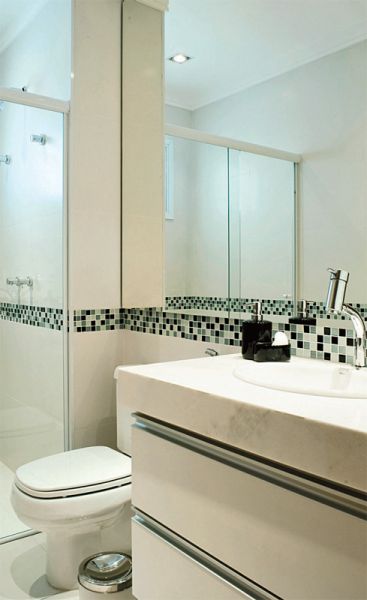 No banheiro, além de também otimizar o espaço apostando em muitos armários, vale investir pesado em muitos espelhos, e tanto para facilitar o momento de se arrumar quanto para criar ilusão de ambiente maior, efeito esse já conhecido do espelho.