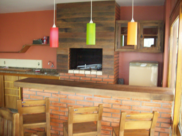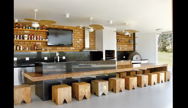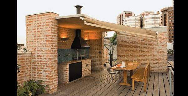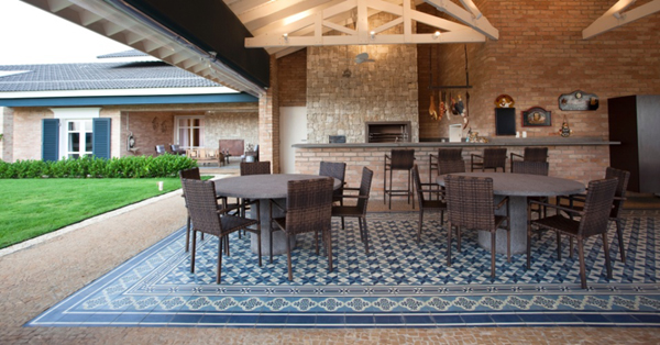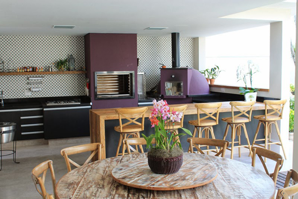 Você pode mesclar estilos em sua área para churrasco. Azulejos coloridos e estampados podem ser usados em conjunto com tijolos mais escuros que ficam aparentes na parede. Esta mistura de estilos deixa o ambiente com visual impactante e muito interessante. Se quiser você pode arrematar a decoração com madeira.
