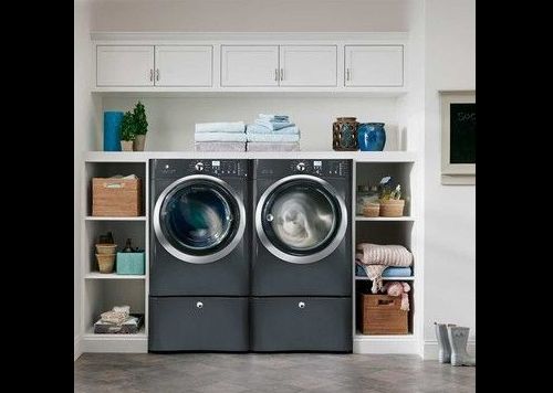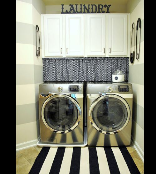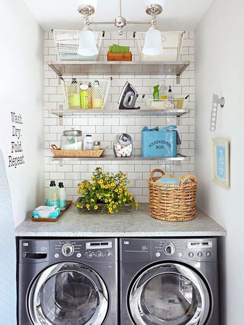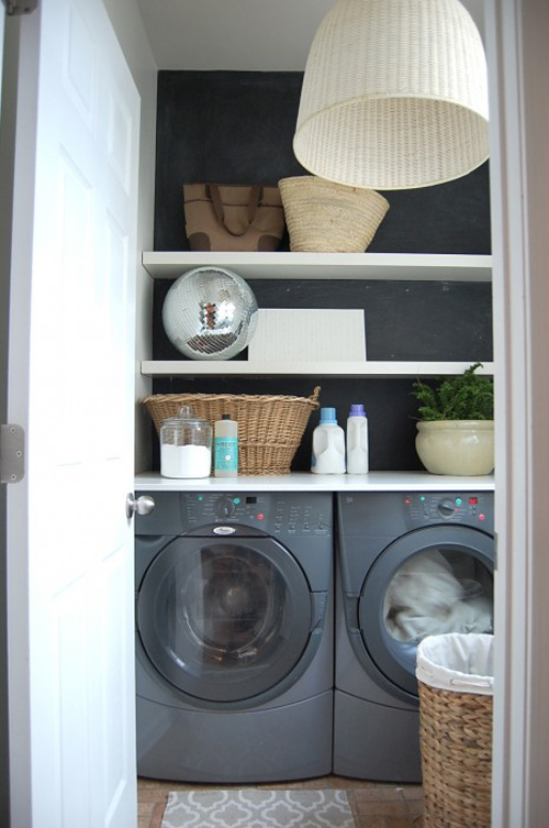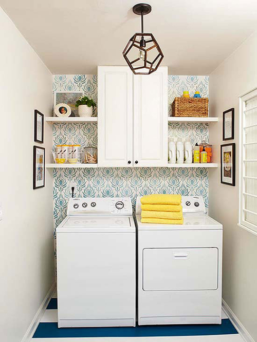 Você pode colocar papel de parede específico para área úmida ou papel contact em sua lavanderia, quadros na parede e tapetes. Você também pode decorar as sua máquina de lavar roupas com recortes de papel contact, com adesivo ou com retalhos de papel e parede. Veja mais exemplos para decoração de lavanderia pequena.