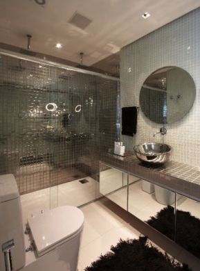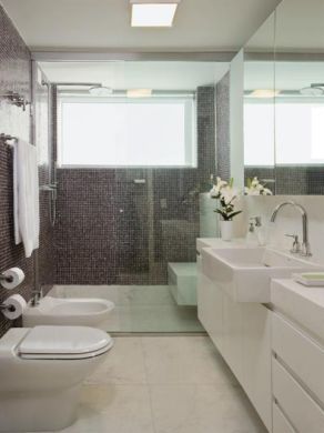 Ainda falando sobre espelho e seu efeito ampliador, você pode aplicar pastilhas espelhadas em uma parede inteira de seu banheiro, pois as pastilhas irão criar o mesmo efeito que um espelho comum, com a grande vantagem de ainda trazer muito mais charme e modernidade para o seu banheiro.