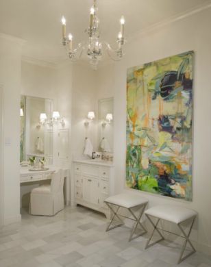 Outra maneira de deixar o banheiro totalmente branco com clima mais descontraído e bem pessoal é investir em quadros ou outros tipos de obras de arte. E se você apostar em quadros ou estatuetas, por exemplo, bem coloridos ou estampados, o resultado será ainda mais interessante.