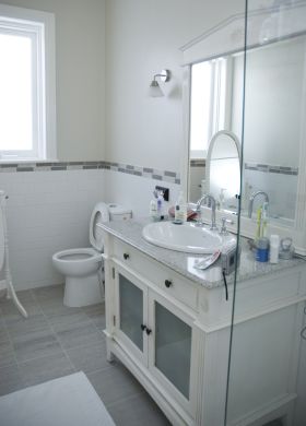 Um banheiro totalmente branco é muito charmoso e pode ter aquela aparência mais fria e impessoal quebrada se você investir em vários objetos de uso pessoal espalhados sobre o gabinete da pia e por todo o banheiro. E estes objetos pessoais se forem bem coloridos garantem mais vivacidade ao seu banheiro branco, além da pessoalidade.
