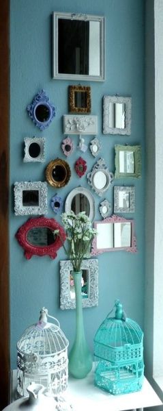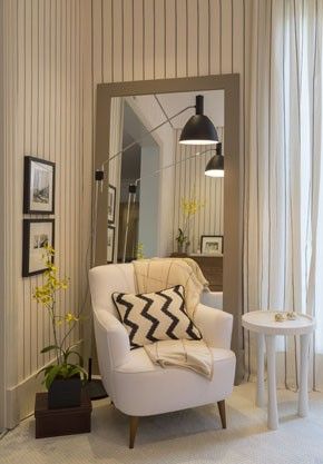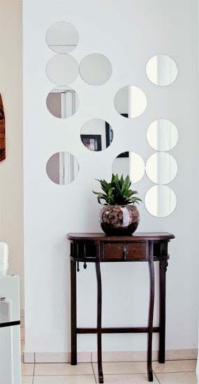 Como o espaço é pequeno, invista em espelhos para tornar o ambiente visualmente maior. E inove no momento de escolher os espelhos, optando por vários redondos e pequenos. Aparador ou mesinha completam o visual interessante do canto da sua sala.