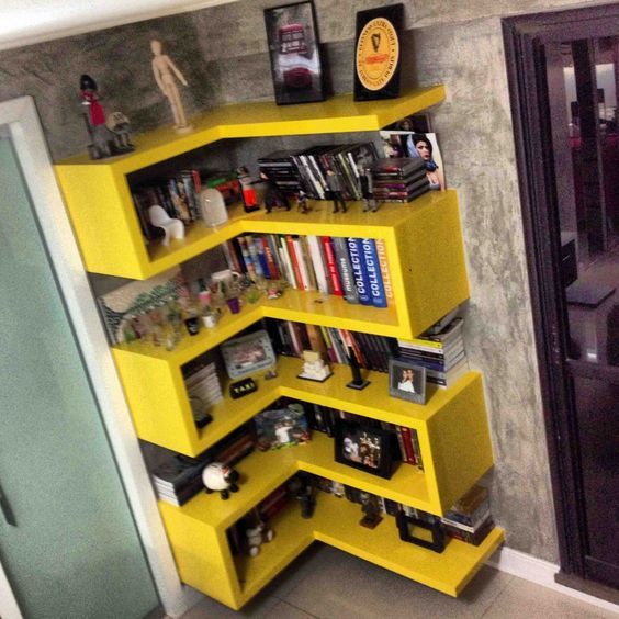 Estantes que pegam o canto inteiro da sua sala também é ótima alternativa para deixar o ambiente mais funcional. Na estante vale guardar livros, revistas, seus objetos de uso pessoal e ainda colocar alguns objetos de decoração.