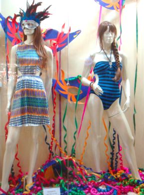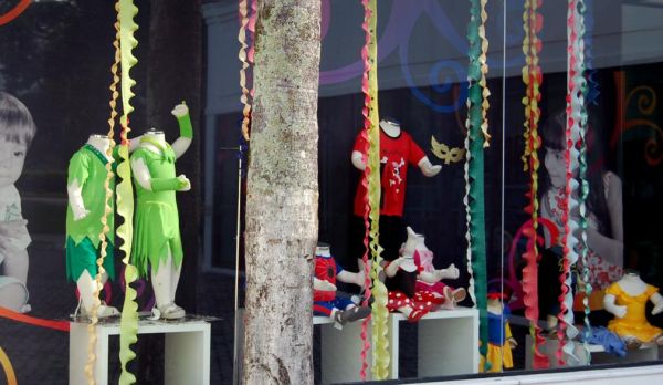 Se você possui uma loja de roupas, pode nesta época do ano deixar os manequins vestidos com peças bem coloridas ou estampadas, pois com isso você garante um toque a mais para este tipo de decoração. E além das peças de roupas e acessórios coloridos e estampados você pode acrescentar elementos típicos do carnaval, como serpentinas coloridas; máscaras de carnaval (podem ser as bem baratas, encontradas em lojas populares), ou até mesmo tiras de papel ou galhos e outros elementos bem coloridos.