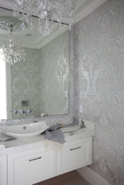 Até mesmo o seu banheiro pode receber elementos com arabescos. Vale combinar duas ou mais peças com arabescos, como moldura do espelho e papel de parede ou lustre e papel de parede com detalhes em arabescos.