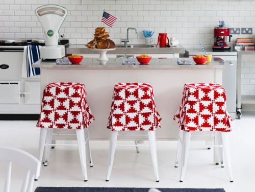 Outra maneira também fácil de incorporar formatos geométricos é optar por estofamentos ou revestimentos de cadeiras com tecidos estampados com formas geométricas. E se você possuir habilidades com trabalhos manuais você mesma pode fazer as capinhas de bancos ou de assentos de cadeiras.
