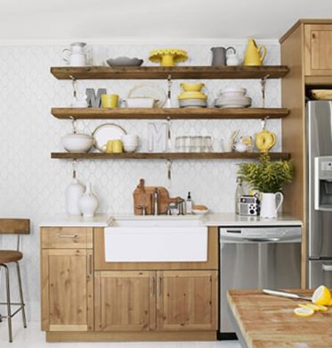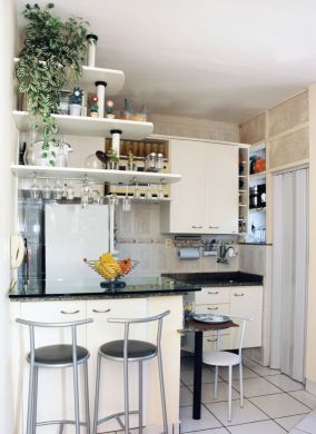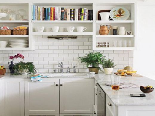Outra alternativa é deixar somente a parte superior de sua cozinha com armários abertos ou com prateleiras e guardar a maior parte de suas panelas e outros objetos em armários fechados (e que não acumulam muita poeira ao longo dos dias) ou na parte de baixo do seu balcão.