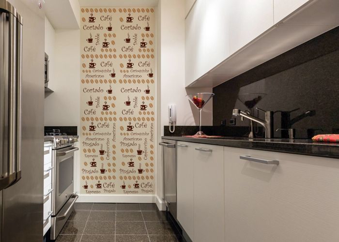 Se você for colocar papel de parede somente em uma parede oposta ao fogão e pia, em uma coluna ou até mesmo para revestir o balcão, você pode optar por papéis de parede tradicionais, pois ficará longe do fogão, o maior responsável pelo acúmulo de gordura no papel de parede e da pia, que fatalmente molhará todo o seu papel de parede com os respingos de água.