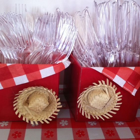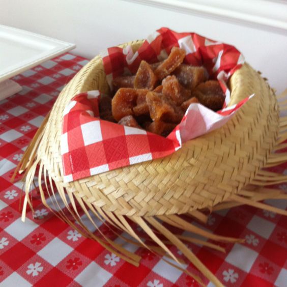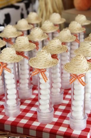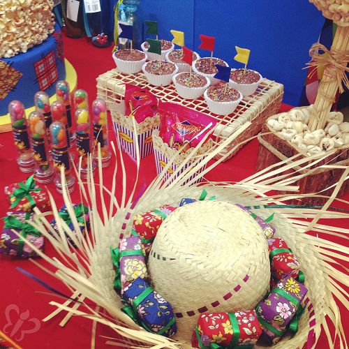 Para acomodar os doces você pode utilizar até mesmo um chapéu de palha como bandeja, além de optar por saquinhos de juta e por canecas ou copinhos decorados.