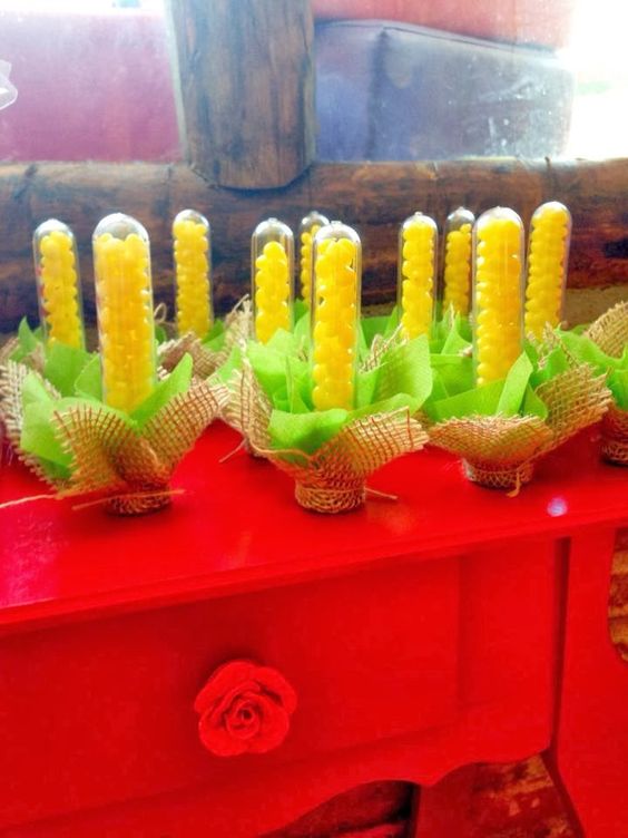 Abuse das espigas de milho para decorar a sua festa. Elas podem estar penduradas no teto, espalhadas pelos cantos da sua festa e também sobre as mesadas dos doces. E podem ser espigas de milho naturais ou artificias. Faça espigas de milho estilizadas com os materiais que você já tem em casa.