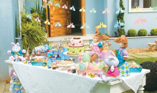 Docinhos, salgadinhos e outros detalhes da festa também podem remeter enfeite em formato de coelho ou de itens que se relacionem com o coelho, com salgadinhos e docinhos em formato de cenoura.