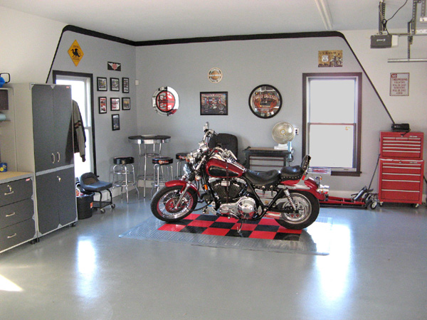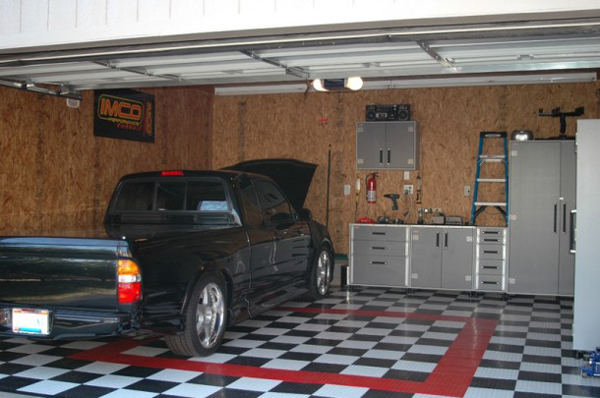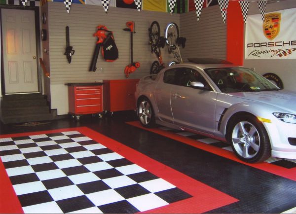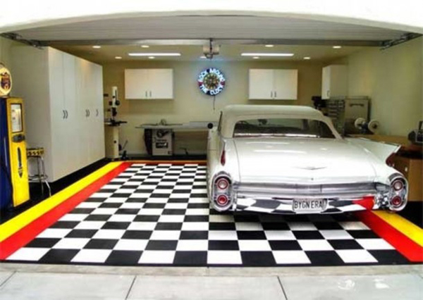 Decorações mais elaboradas para garagens podem contar com armários, prateleiras e painéis com espaços para pendurar ferramentas. O piso da sua garagem pode conter também um revestimento mais fácil de ser limpo ou um padrão diferente para parte do carro, para deixar o ambiente mais charmoso.