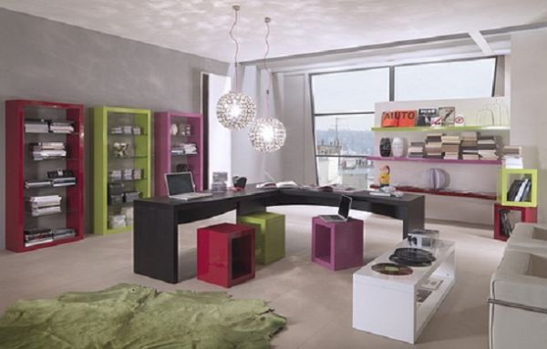 Outra opção, também para quem tem um espaço bem grande em casa para acomodar um home oficie coletivo com uma mesa de trabalho bem grande, é montar um décor bem colorido e divertido, para que os momentos passados estudando ou trabalhando sejam os mais descontraídos possíveis. Porém utilize cores que agradam a todos os moradores que irão frequentar o ambiente, para que este ambiente seja o mais democrático possível e que todos que o utilizem se sintam muito bem neste espaço.