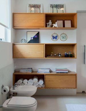 Muitas pessoas acham que banheiro e madeira não combinam, por ser este ambiente muito úmido e viver constantemente em contato com a água e produtos químicos. Porém se você investir na correta marcenaria para banheiros você consegue belos resultados na decoração deste ambiente, e com a vantagem de aumentar e muito seu espaço para guardar produtos de higiene, caso opte por peças de madeira mais funcionais.