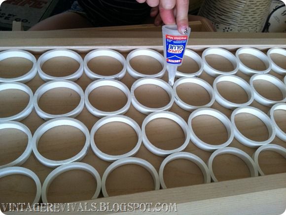 Logo após, fixe as tirinhas de cano de PVC na parte do seu móvel que você quiser, como encaixando as tirinhas de PVC na parte da frente das gavetas do seu móvel ou fixando as tirinhas de cano de PVC em uma moldura, para posteriormente fixar a moldura sobre o seu móvel. Utilize a cola tudo e deixe secar.