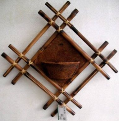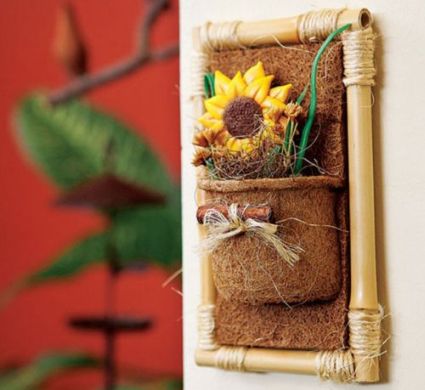 Agora, para finalizar a sua peça, basta você fixar este suporte de coco na moldura de bambu, com o auxílio do arame ou do fio de cobre. E está pronto! E a partir desta ideia você pode fazer enfeites com os modelos que você quiser.
