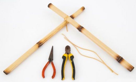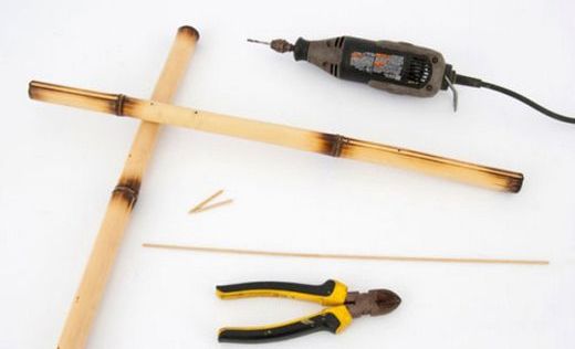 Em seguida, atravesse duas varas de bambu, com o auxílio da furadeira, mas deixando 10 cm em cada extremidade. Faça um furo onde ambas as varas se sobrepõem. Faça outro furo a 5 cm de distância do primeiro. Depois, com o auxílio do alicate de corte, corte pedaços de 3 cm do fio de cobre.