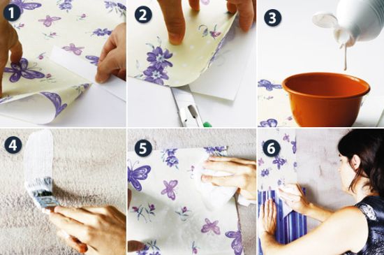 Em quartos, salas e outros ambientes que não recebem gordura, umidade constante ou pingos d’água você pode utilizar o papel de parede comum, um papel tradicional ou até mesmo pedaços de tecidos comuns, colados com cola branca Cascorez diluída em água.