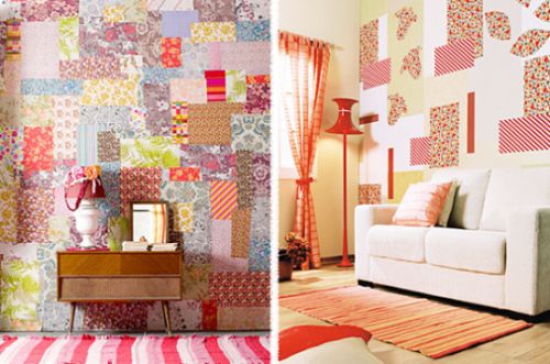 E se você possui habilidade em desenvolver trabalhos manuais você pode fazer o patchwork em sua parede, para isso separe: papéis de presente em várias cores e estampas; régua; barbante; estilete ou tesoura; trincha; cola branca comum; água; e pano. Comece, com o auxílio da régua, fazendo um vinco no papel de presente escolhido. Depois, com o estilete (ou com a tesoura), corte o papel no tamanho que desejar. Agora, misture a cola branca com um pouco de água. Com o auxílio da trincha, aplique a cola branca na parede e cole o papel. Passe o pano limpo suavemente por cima do papel para fixá-lo à parede. E faça isso com quantos pedaços quiser, emendando um ao outro e misturando os formatos, com ora papéis na vertical, ora na horizontal.