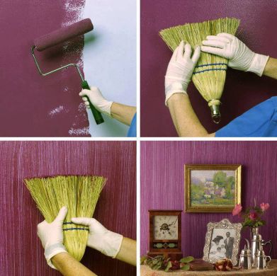 Para deixar sua parede com textura e sem o auxílio de um profissional é muito simples, basta você aplicar a primeira camada de tinta em uma parte da parede com 3 metros por 3 metros, deixar secar por quinze ou vinte minutos (dependendo da espessura da tinta) aplicar outra camada de tinta por todo o local já pintado, esperar cinco minutos e fazer a textura com uma vassoura. Posicione a vassoura perto do teto e desça até o rodapé segurando-a firmemente. Após fazer a textura por toda a parte já pintada, siga para outra parte da parede começando pela pintura.