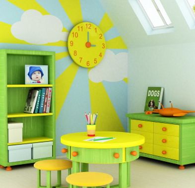 Você também pode colocar quadros ou relógios na parede e ao redor aplicar flores, estrelas ou o detalhe que você quiser, para decorar o item em questão e harmonizar todo o ambiente.