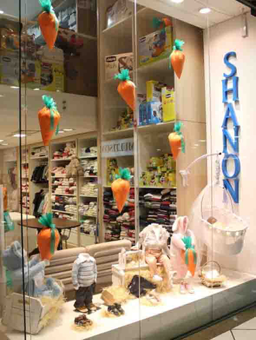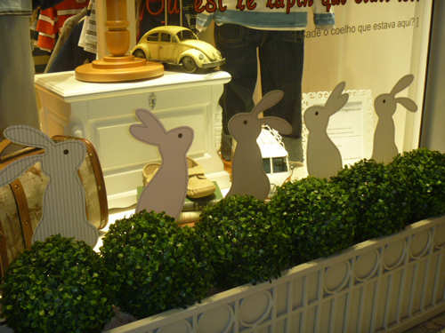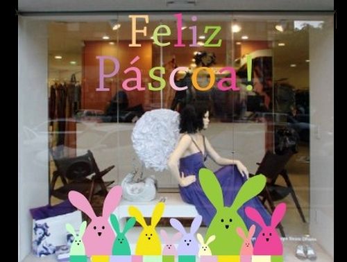 Apenas uma alusão ao tema Páscoa pode ser o ponto forte de sua vitrine. Adesivos de coelhinhos e cenouras espalhadas aqui e ali já garantem o charme que a data pede, mas mantendo a discrição e simplicidade, se este for o seu desejo.
