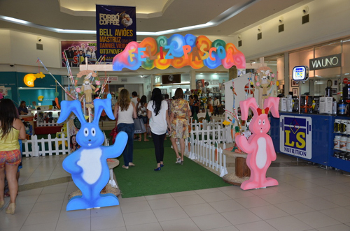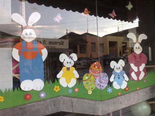 Para quem prefere uma decoração mais chamativa e cheia de detalhes para a vitrine de sua loja ou para a parte de dentro de sua loja, vale apostar em muitos coelhinhos espalhados por todos os cantos do ambiente.