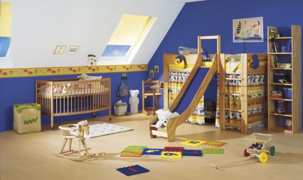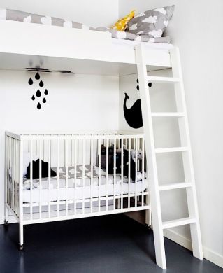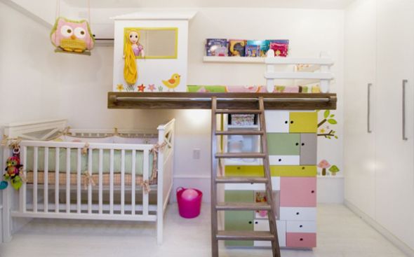 Falta de espaço não pode mais ser desculpa para quem vai fazer uma decoração para dois irmãos com idades diferentes, sendo um bebê. Camas fixadas no alto da parede com um berço posicionado sob esta cama garante conforto para ambos os irmãos e muitos mais espaço no quarto para você incorporar outros móveis, já que você economizará um espaço precioso posicionado o berço sob a cama alta.