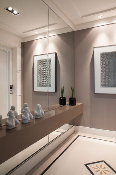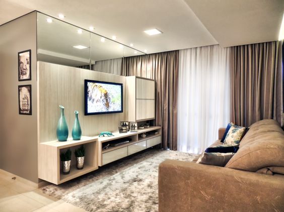 No teto de sua sala, lugar mais tradicional onde o gesso é empregado, você pode brincar com as formas e com a iluminação, você pode fazer sancas abertas ou fechadas e com ou sem iluminação e pode fazer também um teto rebaixado com gesso. E em uma das paredes pode ter um espelho grande ou a parede ser inteira espelhada.