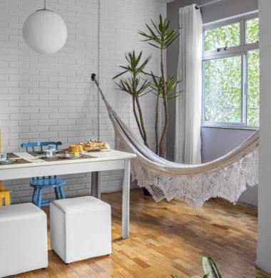 O grande segredo atualmente para montar uma decoração com rede é tratar a rede como um móvel, como uma poltrona ou cadeira, e não mais como uma peça removível, que você retira da parede sempre que quiser, assim você poderá reconhecer mais facilmente qual o local ideal para posicionar a sua rede e quais elementos irão combinar com ela. E procure pendurar a sua rede em uma posição bem próxima à janelas, sacadas ou portas de vidro, para aproveitar a iluminação para ler e, a vista, para aumentar a sensação de descanso.