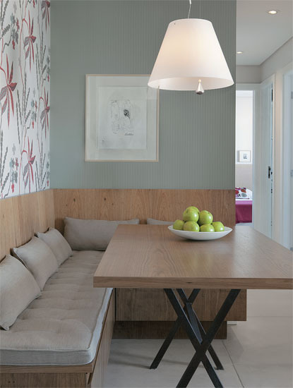 Para criar um espaço moderno para a sua sala de jantar você pode acrescentar cadeiras modernas ao seu canto alemão, com os encostos voltados para o ambiente, e acrescentar também algumas luminárias modernas, que sempre alcançam ótimos resultados.