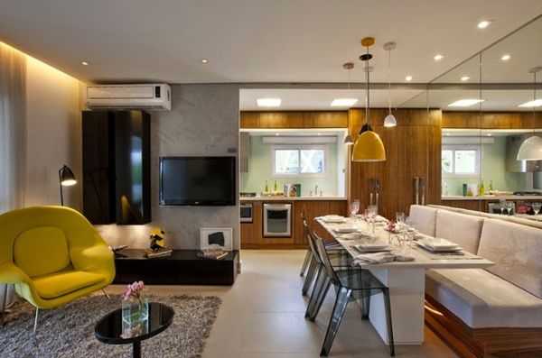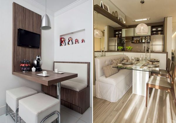 Uma boa dica para quem tem uma sala de jantar pequena e quer acrescentar um canto alemão, é utilizar um espelho de frente para a mesa, para criar uma imagem duplicada da mesa e assim fazer parecer que você tem duas mesas e, consequentemente, um ambiente maior.
