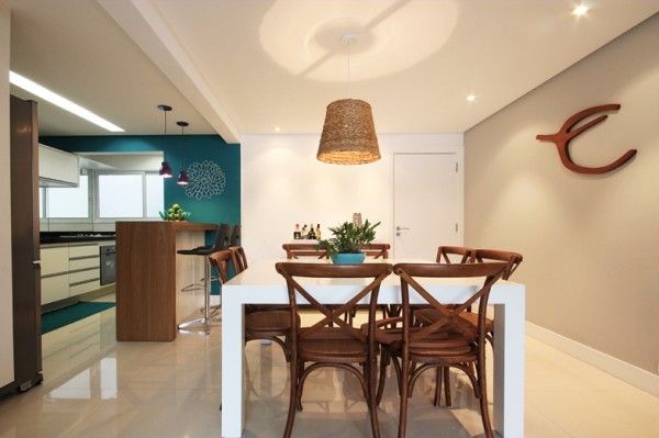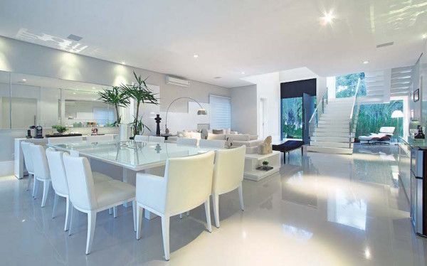 Para quem gosta da cor branca pode montar um ambiente inteiro com esta cor e não somente investindo na mesa de jantar com a cor branca. Teto, piso, parede e outros móveis com a cor branca ganham destaque quando a natureza é incorporada ao espaço, como acrescentar um vaso grande de planta sobre a mesa do jantar ou um vaso grande planta ao lado da mesa de jantar.