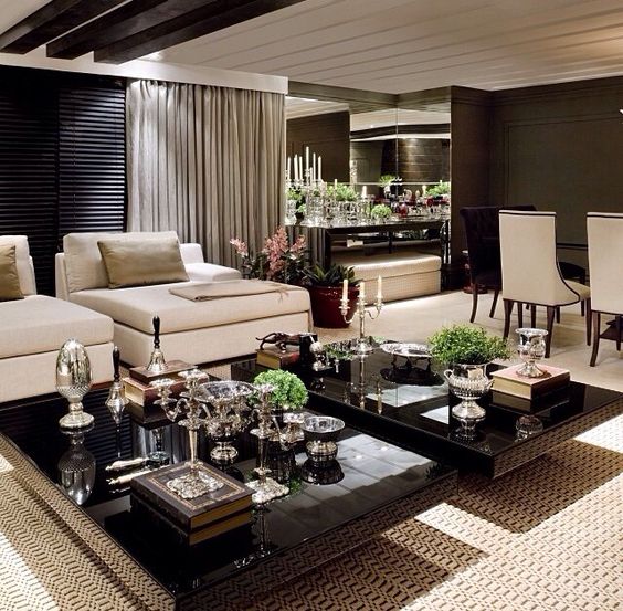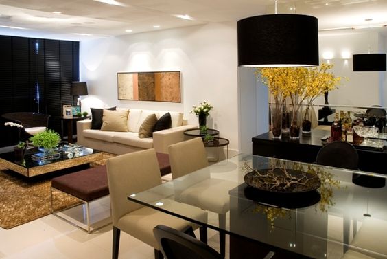 A decoração de sala de jantar e estar juntas pode conter ainda um espelho amplo ou uma parede revestida com espelho, para sofisticar todo o ambiente, além de ampliá-lo. E esta parede espelhada pode estar presente tanto na sala de jantar quanto na sala de estar.