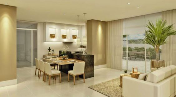 Mesmo em ambientes integrados com sala de estar e jantar juntamente com a cozinha é possível diferenciar e valorizar todo o espaço, para isso basta seguir o padrão, seja com a cor predominante ou com um elemento que esteja presente nos três ambientes.