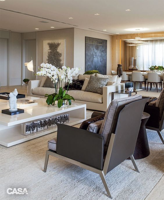 Quem gosta de delimitar os espaços pode posicionar poltronas com as costas viradas para a sala de jantar.