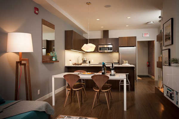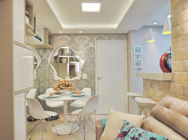 A sala pequena com cozinha americana também se amplia quando é acrescentado um espelho no espaço. O estilo de decoração deste ambiente pode ser o que você desejar e você pode usar vários elementos semelhantes em todos os ambientes integrados, para harmonizar o espaço.