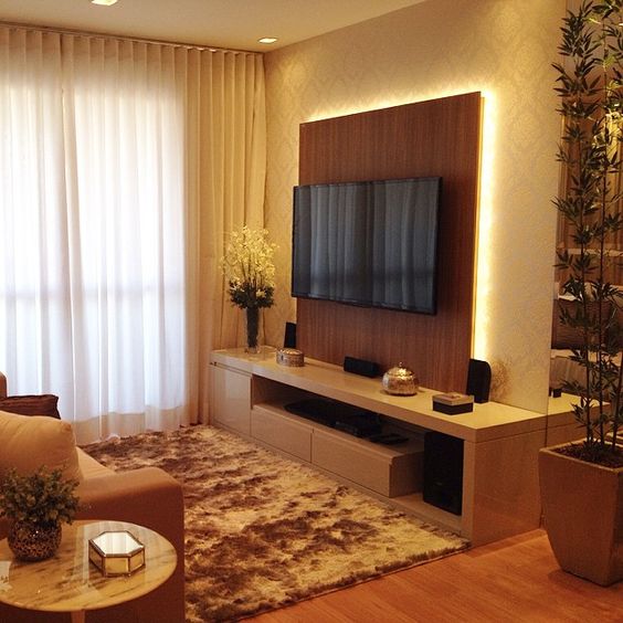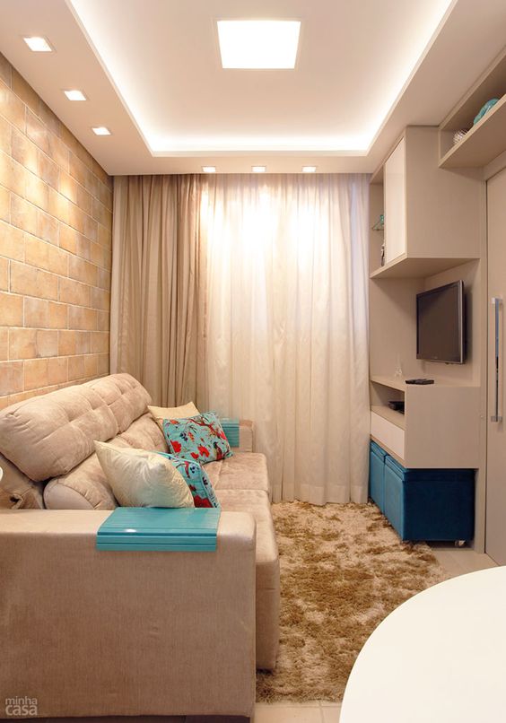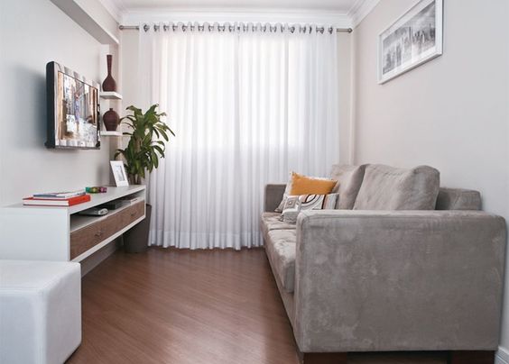 A decoração de salas pequenas com cortinas fica muito mais especial, sem falar que a cortina, neste caso, pode servir de truque de decoração para fazer a sua sala parecer maior.