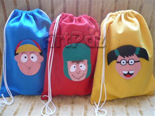 Essas lindas sacolinhas para lembrancinhas podem ser elaboradas com TNT, cordão e decorado com os personagens feito de feltro ou EVA. Para conseguir imagens do Chaves para criar essas decorações aproveite para entrar no portal São Francisco ou no portal Coisadinhos da Alessandra, ontem tem um molde bem legal do Chaves.