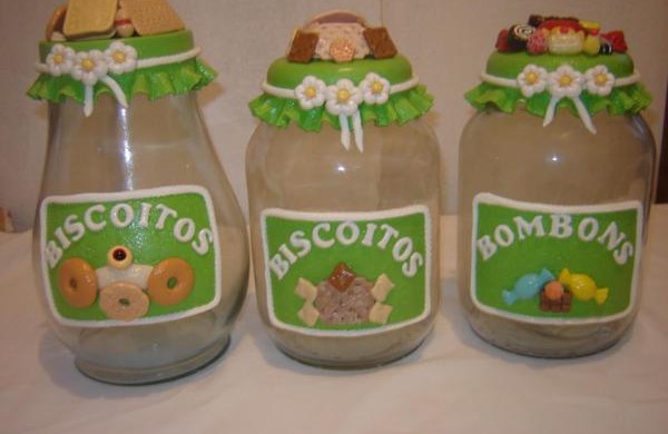Os potes de vidro foram decorados com desenhos de mantimentos que serão armazenados dentro deles. Os biscoitos e doces ganham vida e parecem reais.