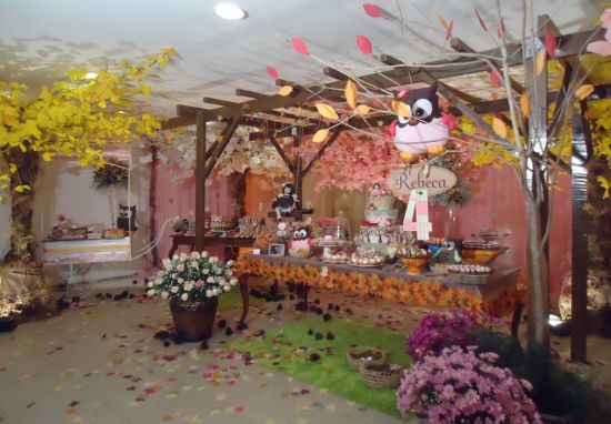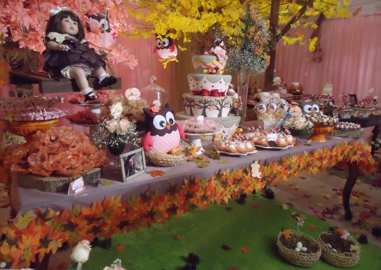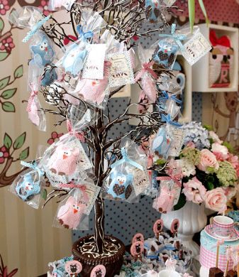 A maneira de dispor suas corujinhas pela decoração da festa também pode sofrer variações, você pode usar as corujas em todos os itens da festa e dispor por todo o salão; como também pode misturar corujinhas com outros elementos, mas lembre-se de que os elementos utilizados devem ter algo em comum com o universo das corujas, como ovinhos, flores e árvores. E você pode, por exemplo, dispor as lembrancinhas penduradas em árvores, que são adoradas pelas corujas.