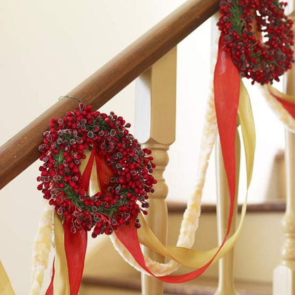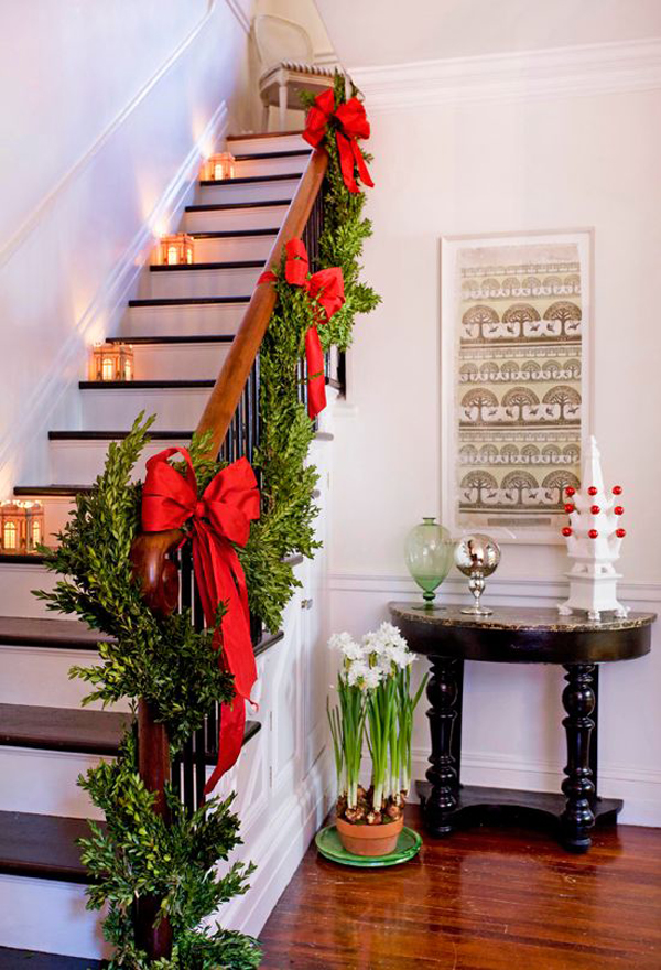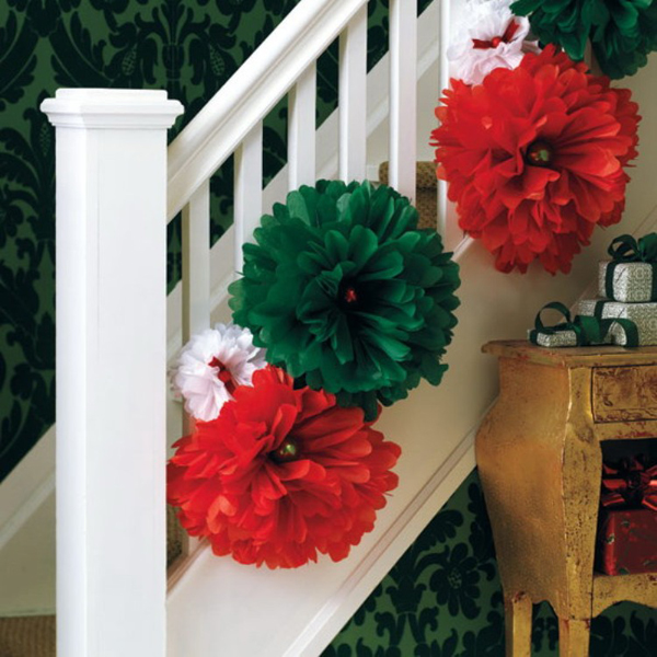 Orçamento apertado pede decoração de escada para Natal com itens improvisados. Compre papel de seda com as cores típicas da época natalina e faça grandes flores. Amarre as flores em sua escada com linha comum e surpreenda pela simplicidade e beleza.