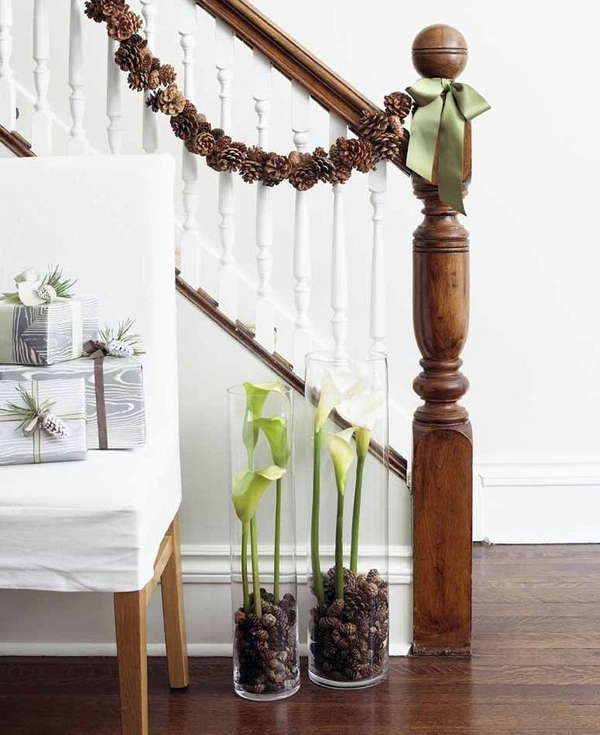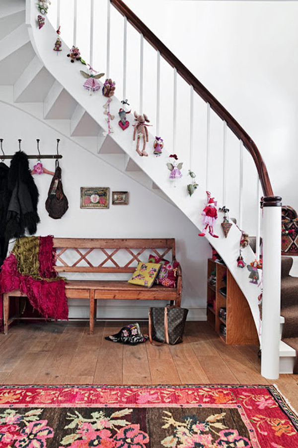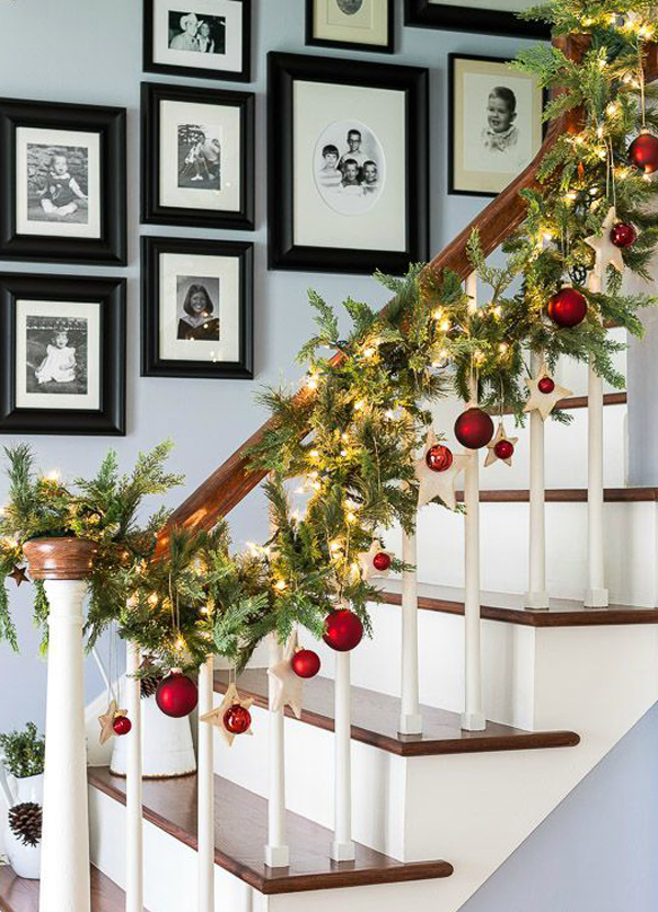 Uma maneira bacana de renovar a decoração de todo o ambiente e, sem gastar nada, é mesclar objetos de decoração de outros ambientes, como usar estatuetas no banheiro ou objetos de uso pessoal, que normalmente ficariam no quarto, em ambientes de convívio social, como sala ou living. Para as escadas vale pendurar quadros com fotos e até as flores que estavam no vaso, juntamente com itens natalinos.