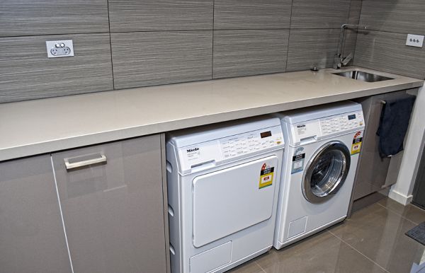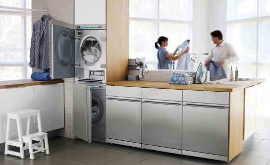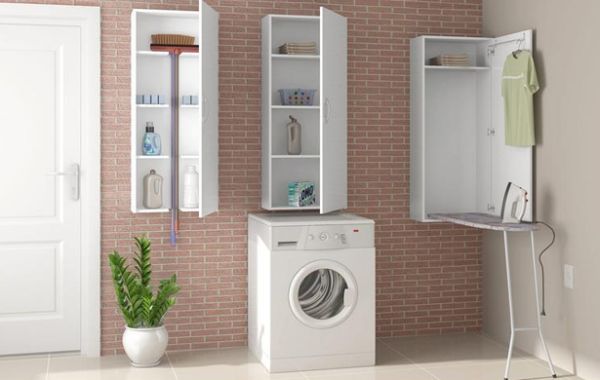 Em espaços muito pequenos você pode incorporar uma máquina de lavar com abertura frontal, assim você poderá colocar um tampo ou balcão sobre ela e utilizar o espaço para passar as roupas. E no caso de você também possuir uma secadora, coloque-a em cima da máquina de lavar, assim você aproveita muito mais o espaço e deixa o ambiente mais organizado e diferenciado.