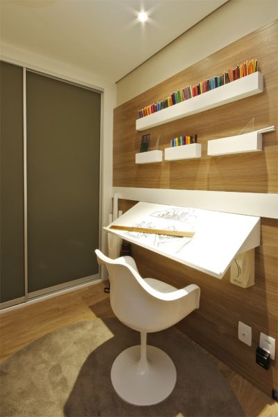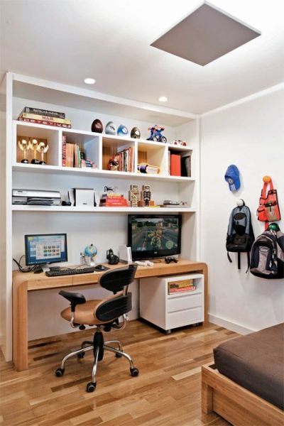 Para quem está buscando otimização de espaço para montar um cantinho de estudo ou leitura vale apostar em miniescrivaninha acoplada à cama do jovem, por exemplo, em caso de pouco espaço na casa e você precisar montar o espaço cultura no quarto do seu filho. Gaveteiro com rodinhas que se encaixa na parte debaixo da escrivaninha é ótima opção para aumentar o espaço útil para o seu filho guardar os seus pertences. Para deixar o espaço ainda mais funcional e decorado de forma diferenciada, invista pesado em nichos fixados na parede, para tanto acomodarem livros quanto objetos decorativos.
